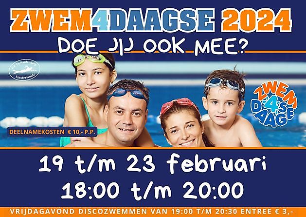 Vanaf 19 februari start de zwem4daagse in het overdekt zwembad in Finsterwolde. Deze wordt georganiseerd door zwemvereniging de Hardenberg.
